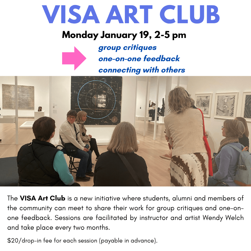 These sessions will provide a way to become part of a like-minded community of artists as well as help you develop a consistent and personal art practice. You are asked to bring in an artwork that you have completed in the last two months. Don’t have any artwork? Let this be a motivation to make something for the VISA Art Club meeting.