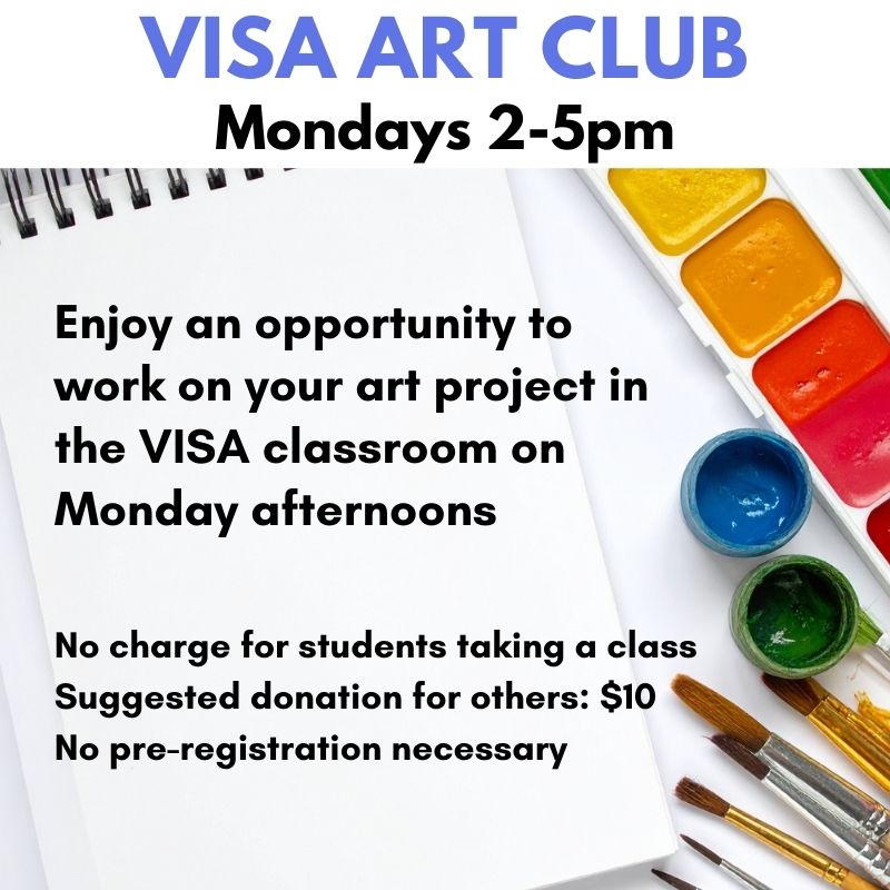 We are revising the concept of the VISA Art Club. The original idea was for people to bring in work and have it discussed in a group situation and on a one-on-one basis. As there was little interest in this kind of set-up, we are changing it to a drop-in studio sessions where people can work in the classroom. There is no charge for the sessions if you are student and a suggested $10 donation. No pre-registration is necessary. Just drop-in on Monday between 2-5pm. There is no facilitator but a good opportunity to work in the same space as others.
